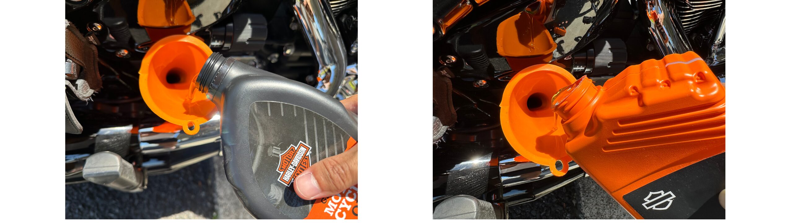 オイルファンネルを注入口にセットし、オイルを注いでいきます。筆者のバイク「Harley Davidson Breakout114(2022年)」は、1クオート(約0.95リットル)を3本入れていきます。