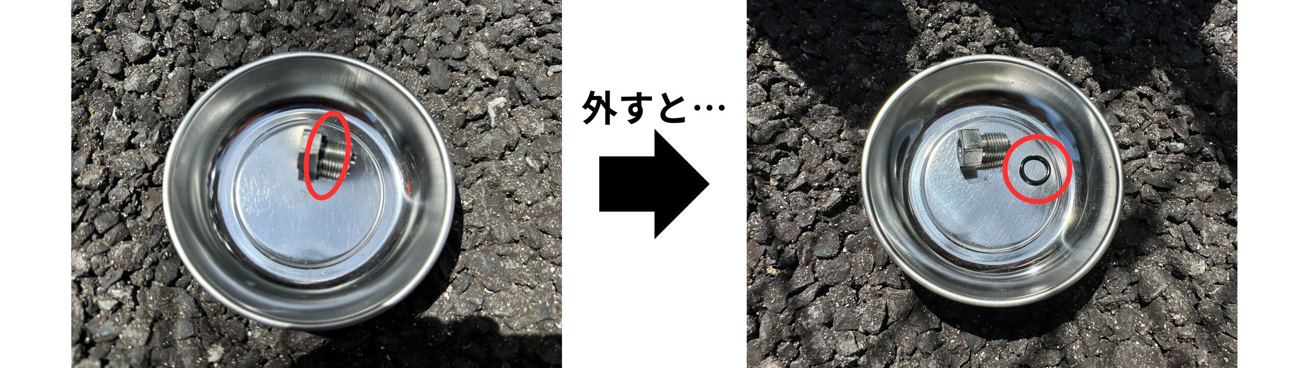 Oリングはドレインボルトと車体のすきまを埋めるゴム製の部品です。Oリングがないとオイルが漏れる危険性があります。