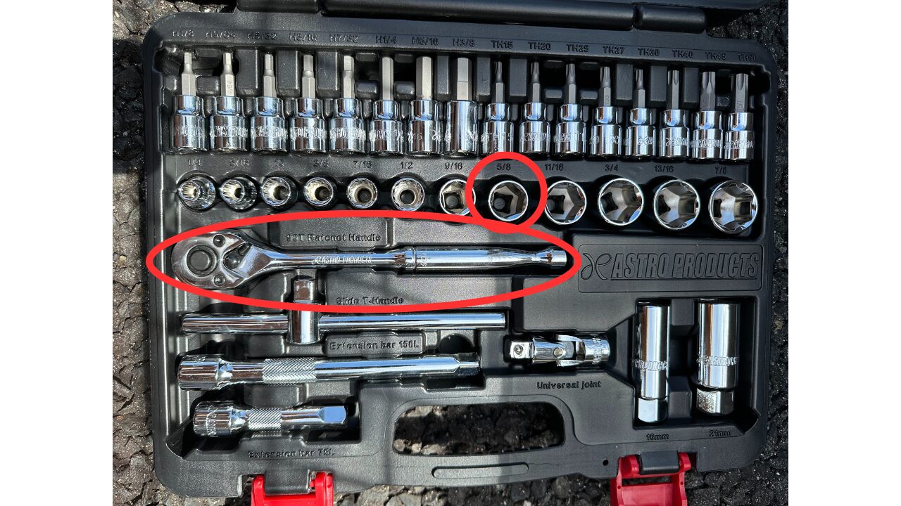 今回使用する工具は「六角ソケット(5/8インチ)」「ラチェットハンドル」の2つになりますね。
