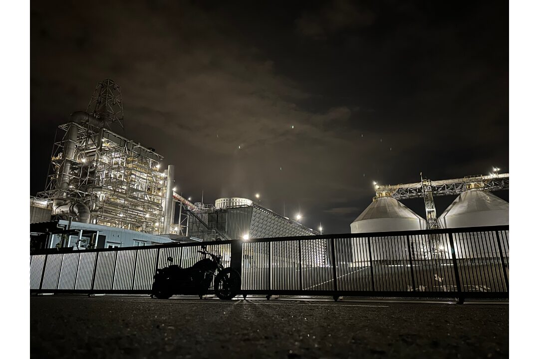 この通りは街灯があまりなく、工場の明かりだけになるのでめちゃめちゃ映えますね。