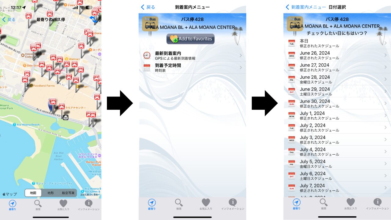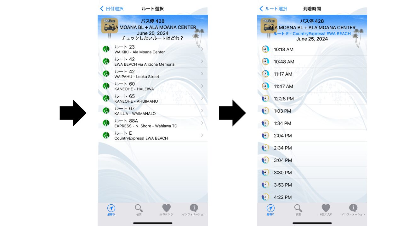 今、自身のいる場所からバス停を探すこともできますし、日にち・ルートごとに時間を知ることができますよ。